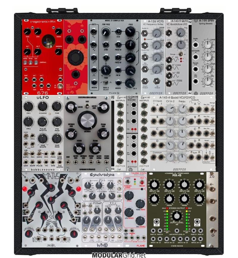 Flame Talking Synth; Harvestman Hertz Donut; ASol and ASys; Bubblesound VCOb; Cwejman VCO6; Doepfer; Kilpatrick K3020, Metasonix R55; MFB Triple; Pittsburgh Generator;